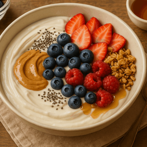 A refreshing and protein-rich breakfast bowl featuring creamy Greek yogurt, fresh berries, almond butter, and crunchy granola — perfect for a nutritious start to your day.